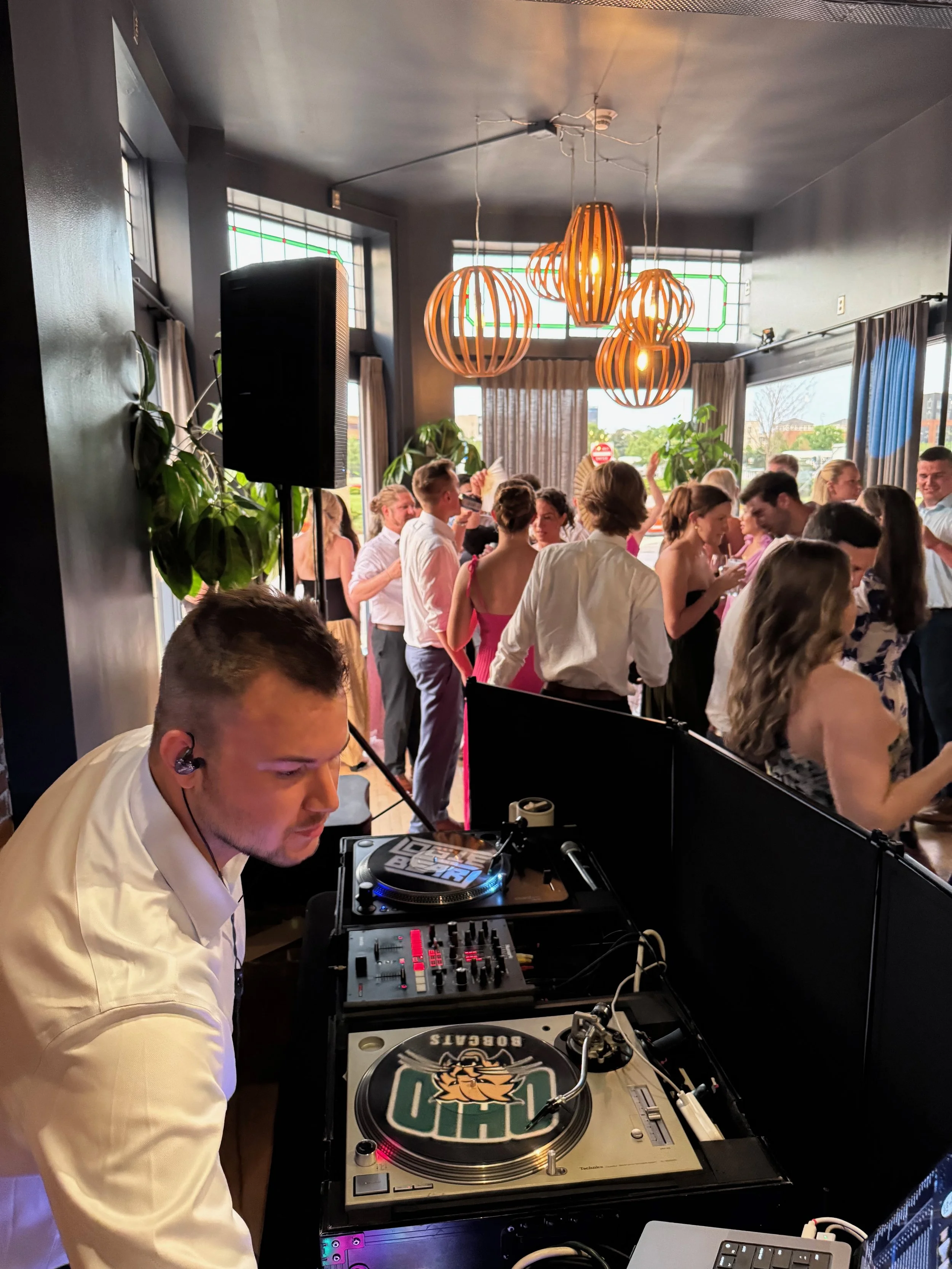 Here's the thing most couples don't know to ask about: real mixing versus playlist DJing. A lot of wedding DJs don't actually mix — they queue up full songs back-to-back, talk on the mic between them, and hope the energy carries. I came up working clubs and bars in Columbus — places like Good Night John Boy and VASO, where you can't get away with that. If the mix falls flat for three minutes, people leave. That training translates directly to wedding receptions: the dance floor stays full because the music never stops, and the transitions are actually musical.